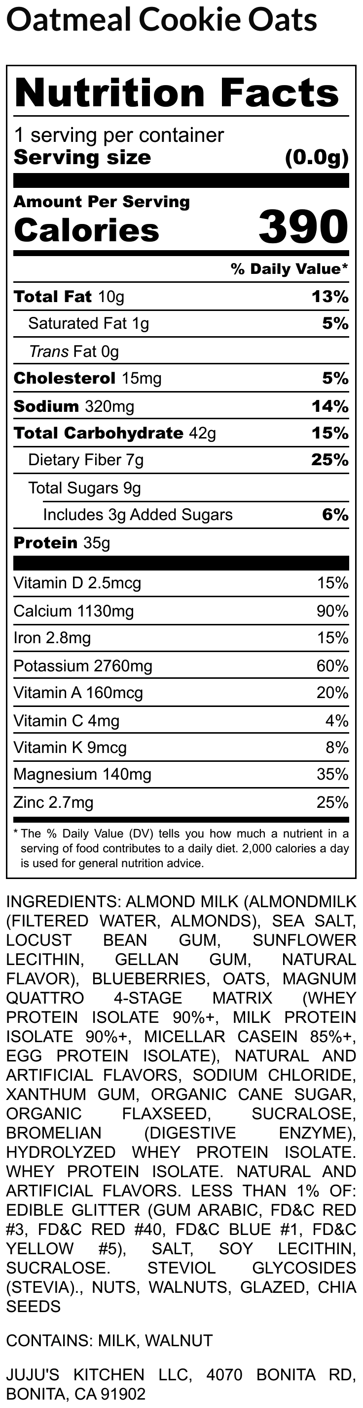 Oatmeal cookie and fudge flavored almond milk with chia seeds, oats, chopped walnuts, and blueberries